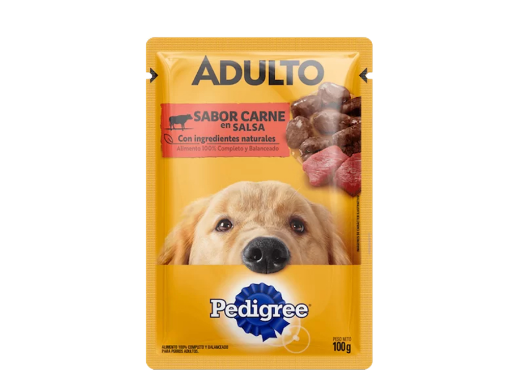 Salsa Pedigree Sobrecito sabor carne en salsa es alimento húmedo nutricionalmente completo y balanceado. Formulado para el mantenimiento de perros adultos, elaborado a base de exquisitos trocitos de carne cocidos al vapor en una deliciosa salsa: