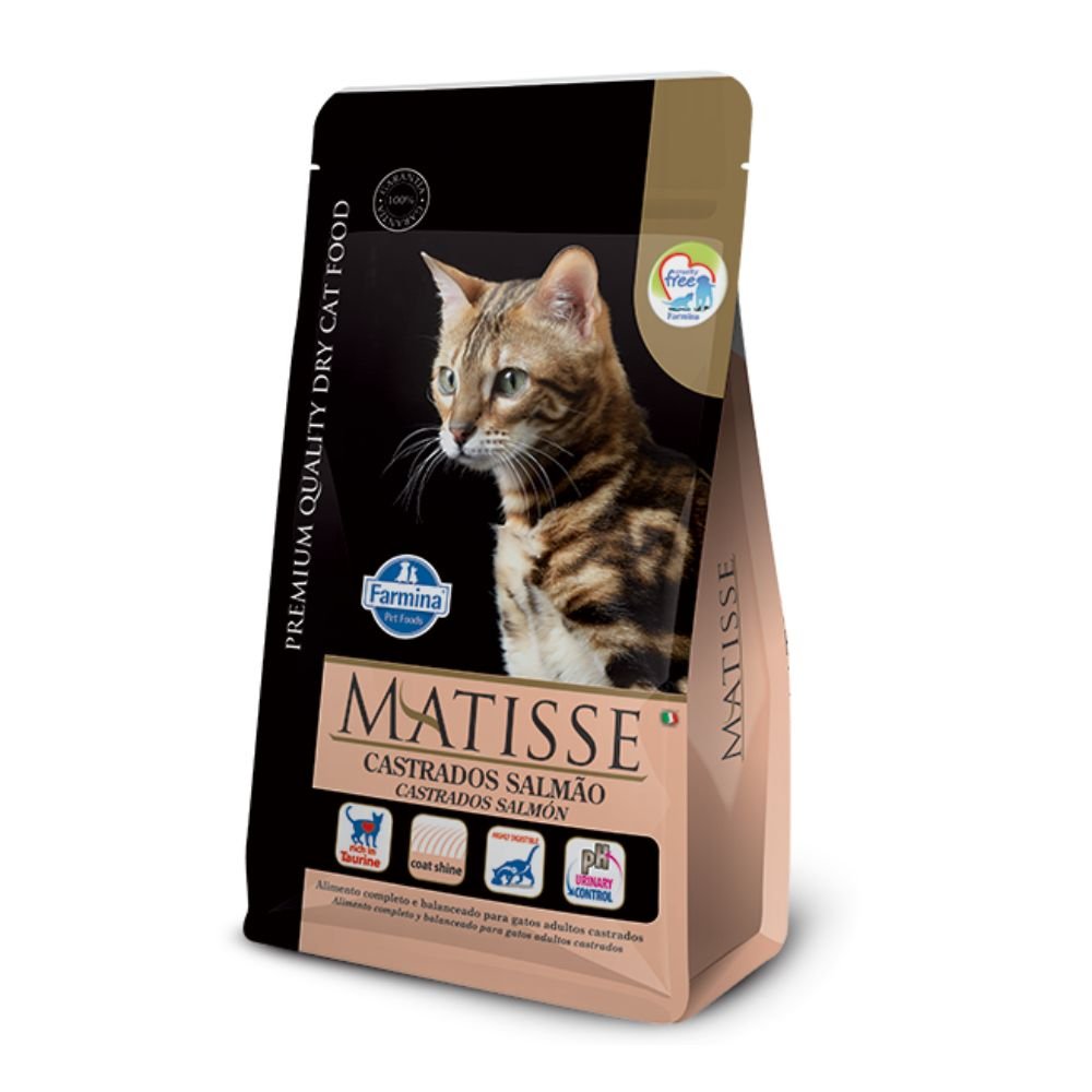 Matisse Salmón para gatos castrados es un alimento premium especialmente diseñado para cubrir las necesidades nutricionales de gatos adultos esterilizados. Con salmón como fuente principal de proteína, esta fórmula apoya el mantenimiento del peso ideal, una digestión saludable y el bienestar general de tu gato.
