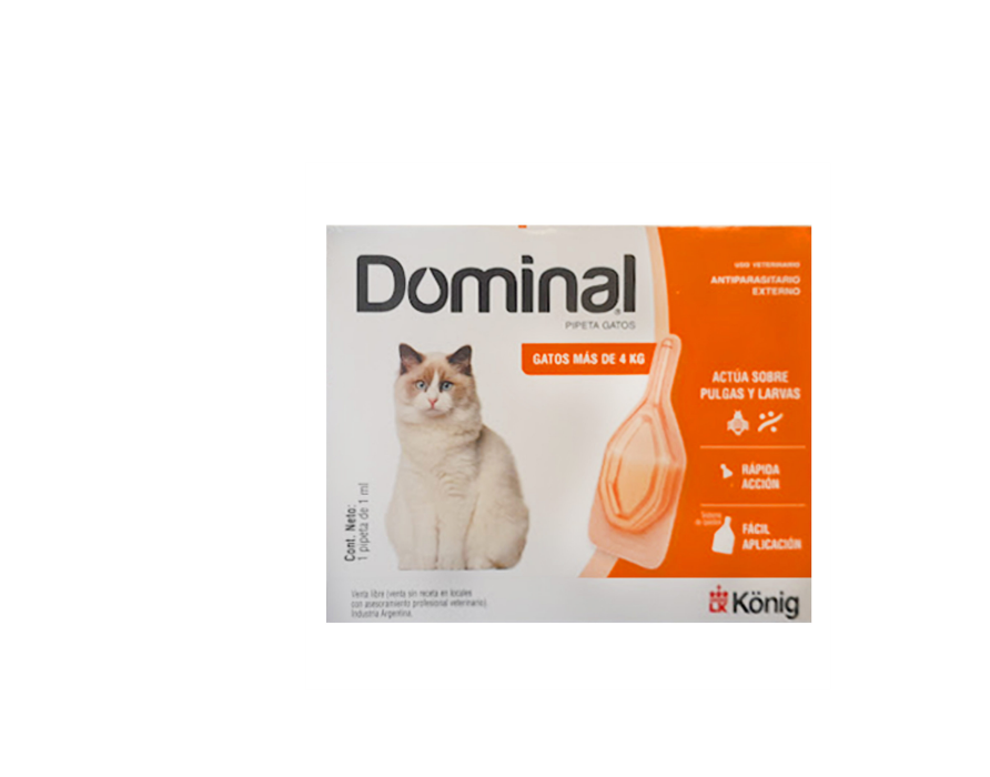 Protege a tu gato de pulgas y garrapatas de forma rápida y sencilla con la Pipeta Dominal. Diseñada específicamente para gatos que pesan más de 4 kilogramos, esta solución tópica de unción dorsal es la clave para mantener a tu felino saludable y libre de parásitos externos.
