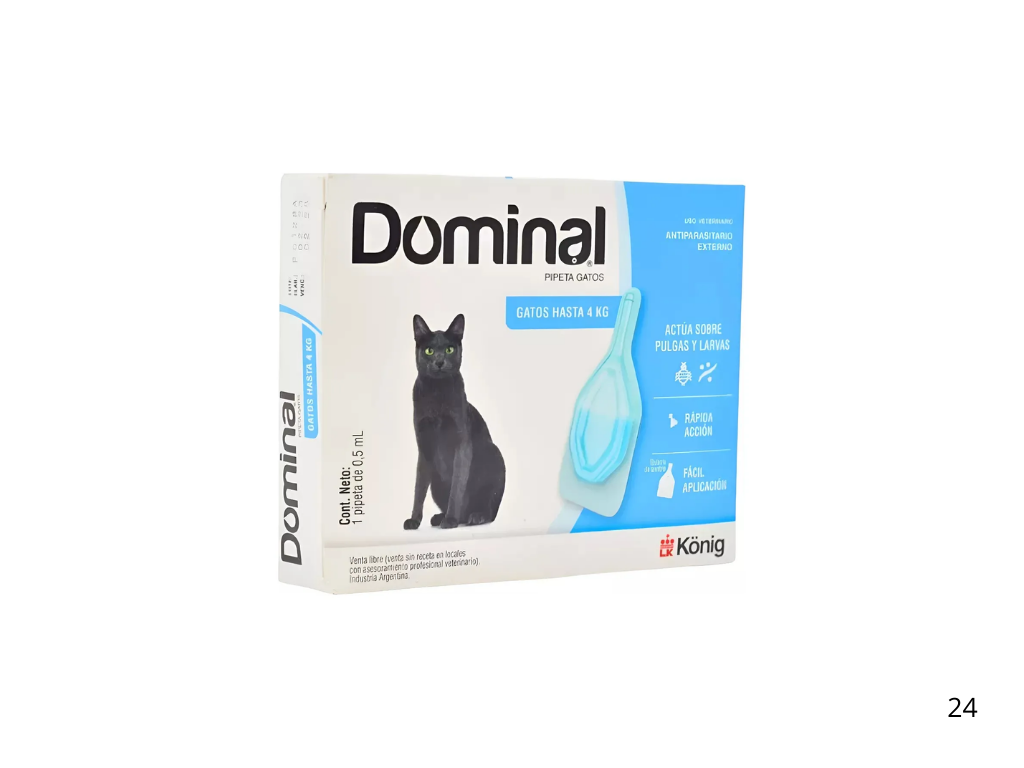 Protege a tu gato de pulgas y garrapatas de forma rápida y sencilla con la Pipeta Dominal. Diseñada específicamente para gatos que pesan hasta 4 kilogramos, esta solución tópica de unción dorsal es la clave para mantener a tu felino saludable y libre de parásitos externos.