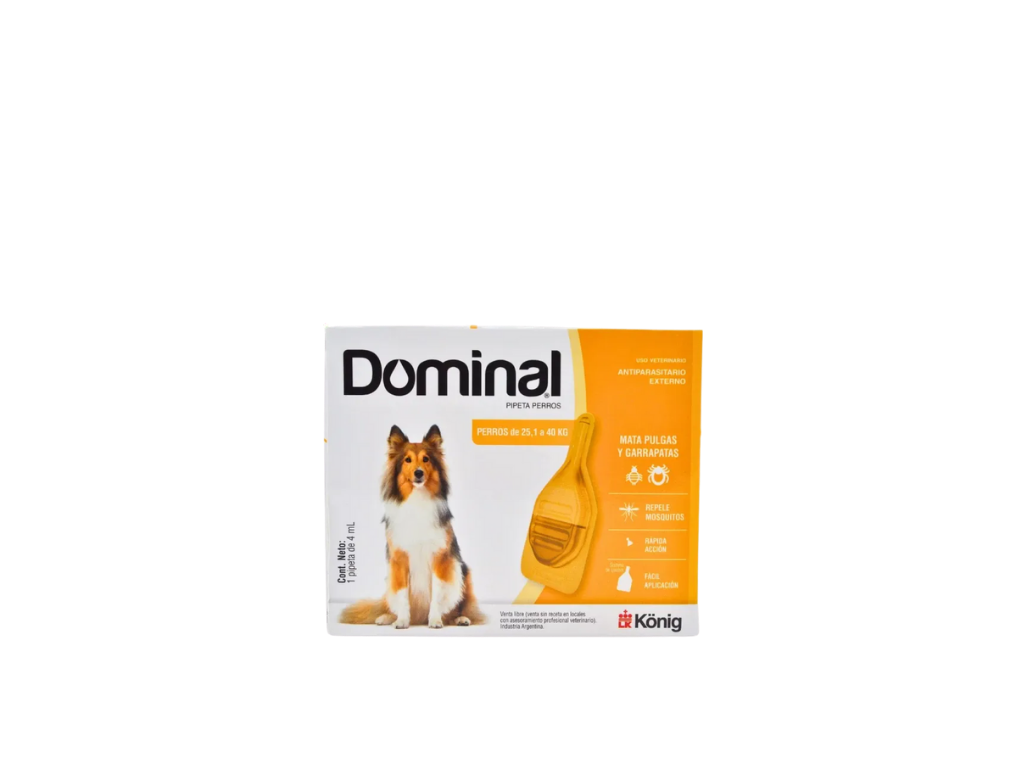 La pipeta antipulgas Dominal para perros de 25 a 40 kg es una solución tópica de acción rápida diseñada para eliminar y repeler parásitos externos, proporcionando protección mensual.