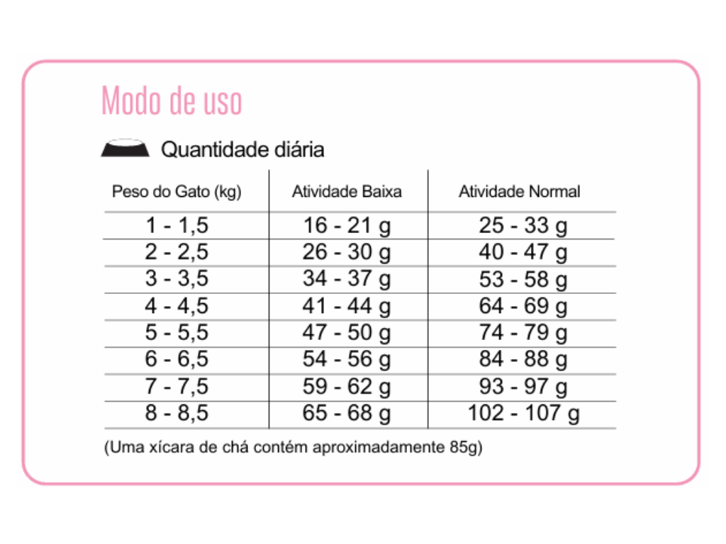 Carne mecánicamente separada de aves, harina de vísceras de aves, harina de peces, aceite de aves, aceite de pescado refinado blanqueado y desodorizado, grano de maíz, salvado de gluten de maíz 60, grano de linaza, pulpa de remolacha, salvado de soja, arroz quebrado, fibra de caña de azúcar, levadura de cerveza inactivada deshidratada, arándano (cranberry), cloruro de sodio, hexametafosfato de sodio, cloruro de potasio, bisulfato de sodio, extracto de yuca, L-lisina HCl, DL-metionina, taurina, aditivo prebiótico (pared celular de levadura – fuente de manano-oligosacáridos), aditivo probiótico, hidrolizado de hígado de aves, extracto de romero, concentrado de tocoferoles, ácido propiónico, cloruro de colina, premezcla vitamínica mineral.