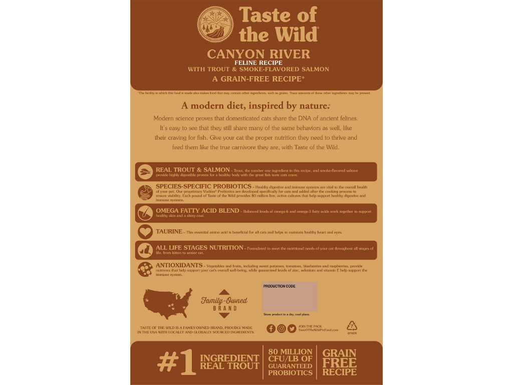 La trucha, ingrediente principal de esta receta, y el salmón ahumado aportan proteínas de fácil digestión para un cuerpo sano, con el delicioso sabor a pescado que tanto les gusta a los gatos. La receta para gatos Taste of the Wild Canyon River está formulada para cumplir con los niveles nutricionales establecidos por los perfiles nutricionales de alimentos para gatos de la AAFCO para todas las etapas de la vida.
