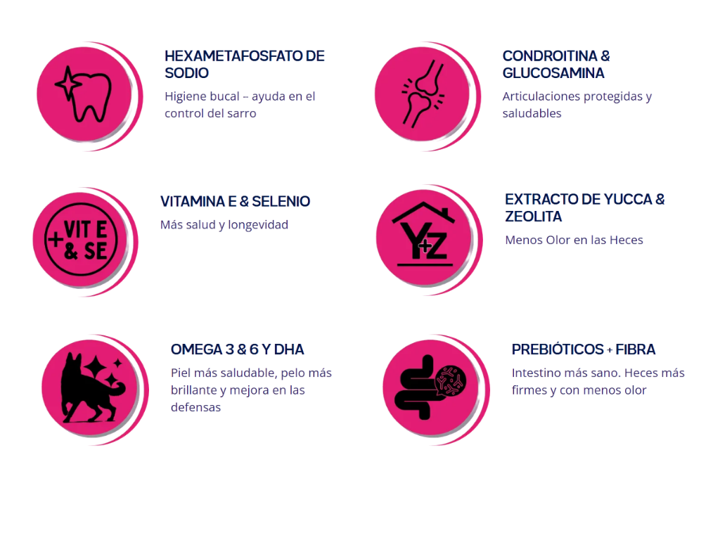 Harina de vísceras de pollo, maíz integral molido, harina gluten de maíz 60, pulpa de remolacha, harina de alga, hígado de pollo hidrolizado, grasa de pollo, hígado de cerdo hidrolizado, cloruro de sodio (sal común), cloruro de potasio, ácido cítrico, antioxidante (BHA y BHT), ácido propiónico, vitaminas (A, D3, E, B1, B2, B6, B12, K3, ácido nicotínico, ácido fólico, biotina, pantotenato de calcio y cloruro de colina), sulfato de zinc, yodato de calcio, selenito de sodio, sulfato de cobre, sulfato de hierro, sulfato de manganeso, óxido de zinc, hexametafosfato de sodio, manano-oligosacáridos, sulfato de condroitina, sulfato de glucosamina, bentonita, zeolita y extracto de Yucca schidigera.