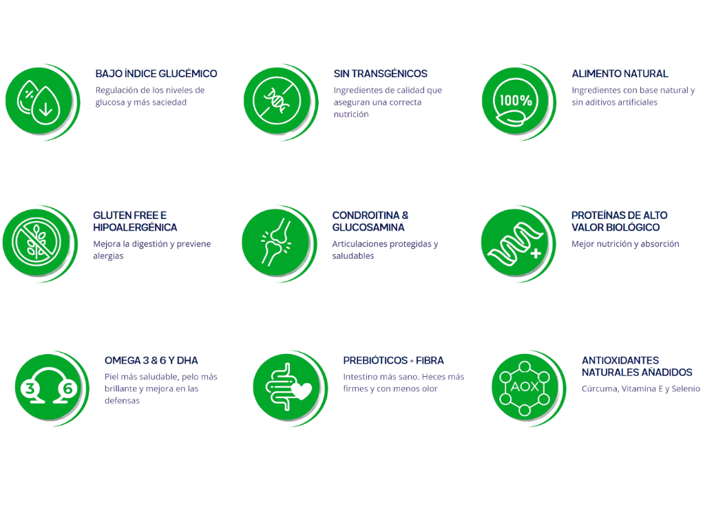 Harina de vísceras de pollo, harina de salmón, huevo integral en polvo, sorgo integral molido, hígado de pollo y cerdo hidrolizado, grasa de pollo, hematíes deshidratado de bovinos, harina de coco, harina de manzana, harina de linaza, pulpa de remolacha, vegetales deshidratados (zanahorias, guisantes, camote, remolacha, peregil, calabaza, apio y espinacas), cúrcuma, levadura de caña de azúcar autolizada, harina de alga, metionina, cloruro de sodio (sal común), cloruro de potasio, ácido cítrico, ácido propiónico, vitaminas (A, D3, E, B1, B2, B6, B12, K3, ácido nicotínico, ácido fólico, biotina, pantotenato de calcio y cloruro de colina), sulfato de zinc, yodato de calcio, selenito de sodio, sulfato de cobre, sulfato de hierro, sulfato de manganeso, óxido de zinc, antioxidante natural (tocoferol, extracto de romero y extracto de té verde), hexametafosfato de sodio, manano-oligosacáridos, bentonita, zeolita, extracto de Yucca schidigera, sulfato de condroitina y sulfato de glucosamina.