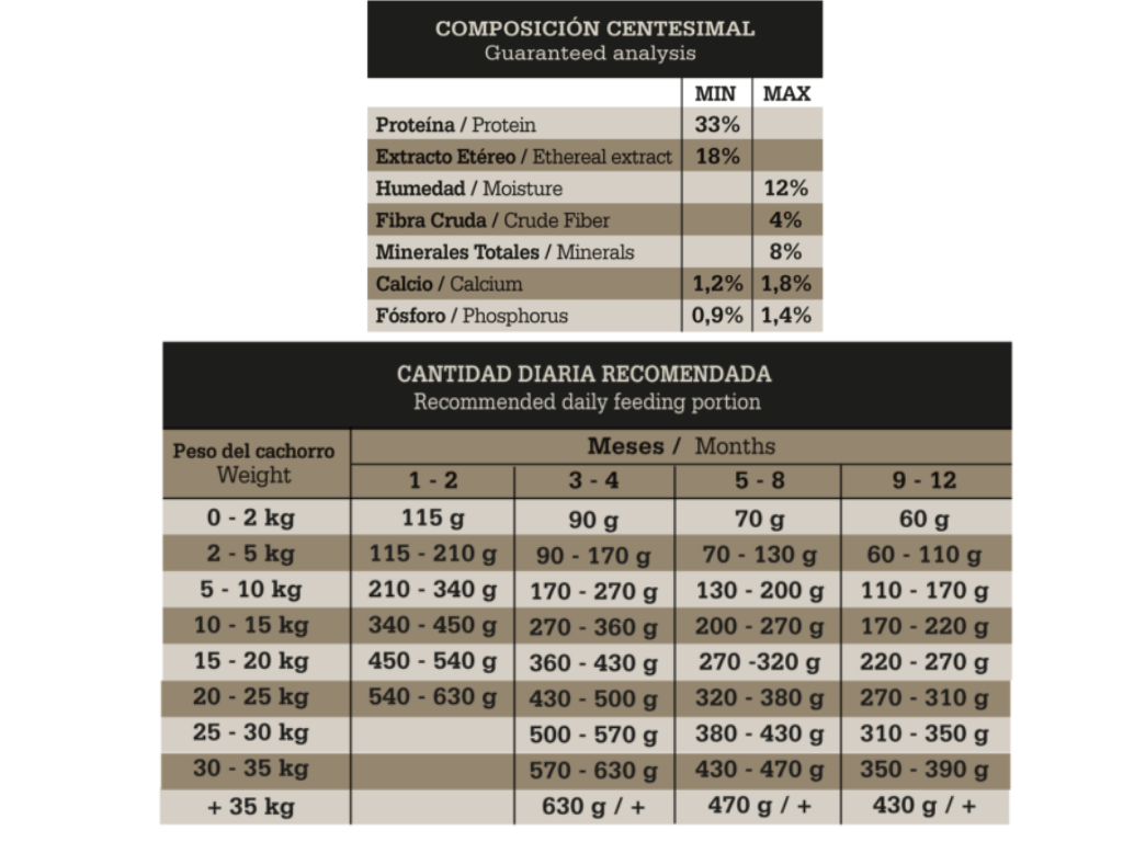 Indicado para cachorros de razas medianas y grandes hasta el final del crecimiento. Servir la cantidad diaria recomendada según peso y nivel de actividad. Mantener siempre agua fresca disponible y almacenar en lugar seco y fresco.