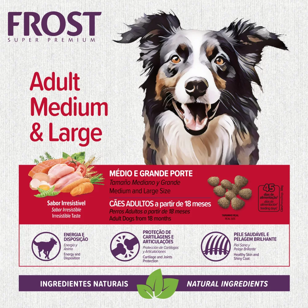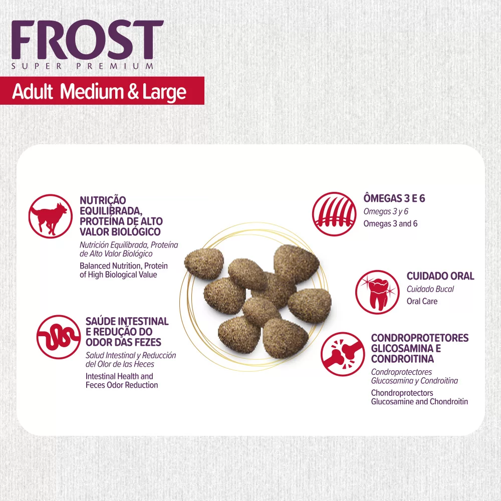 Desarrollado para perros de razas medianas y grandes, con proteínas de alto valor biológico, ácidos grasos omega 3 y omega 6, glucosamina y condroitina para promover la salud y la longevidad. Su fórmula concentrada permite una alimentación más nutritiva, promoviendo una mayor saciedad en porciones más pequeñas y reduciendo el volumen de las heces.