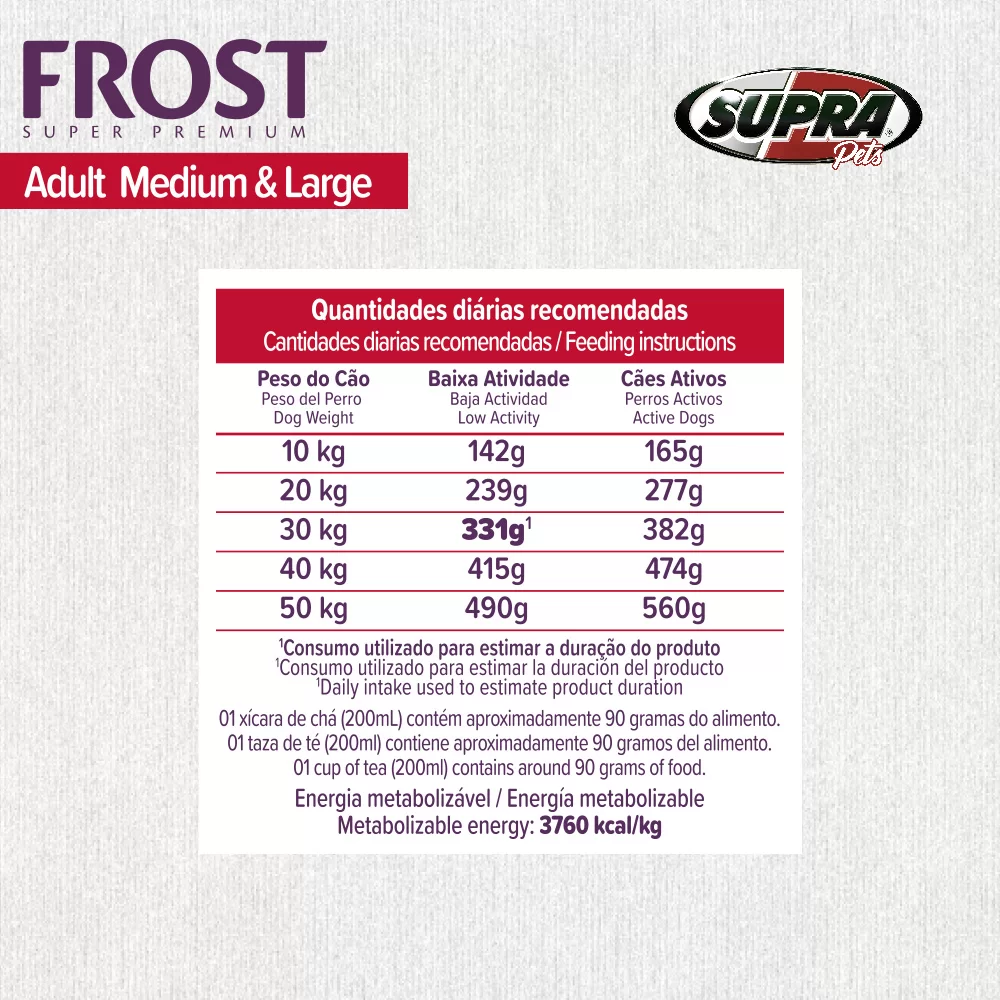 Humedad (máx) 100g/kg (10%), Proteína Cruda (mín) 260g/kg (26%), Grasa (mín) 140g/kg (14%), Fibra (máx) 25g/kg (2.5%), Cenizas (máx) 80g/kg (8%), Cálcio (mín) 9000mg/kg (0.9%), Cálcio (máx) 15g/kg (1.5%), Fósforo (mín) 8000mg/kg (0.8%), Omega 3 (mín) 4000mg/kg (0.4%), Omega 6 (mín) 20g/kg (2%), Sodio (mín) 2000mg/kg (0.2%), Potasio (mín) 5000mg/kg (0.5%), Taurina (mín) 1000mg/kg, Sulfato de Glucosamina (mín) 600mg/kg, Sulfato de Condroitina (mín) 150mg/kg, Mananoligosacaridos (mín) 240mg/kg, Fructoligosacaridos (mín) 1750mg/kg, Cobre (complejo orgánico) (mín) 3mg/kg, Selênio (complejo orgánico) (mín) 0.12mg/kg, Zinc (complejo orgánico) (mín) 40mg/kg.