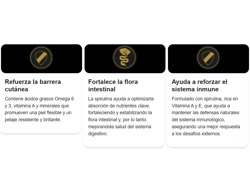 Contiene ácidos grasos Omega 6 y vitamina A, que sumados a ácidos grasos Omega 3 y minerales, promueven una piel flexible y un pelaje resistente y brillante, actuando como la primera linea de defensa que tiene un perro contra amenazas externas.